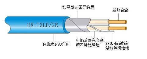 它結構包括有:護套:藍色聚氯乙烯( PVC ); 接地線:鍍錫銅絲; 屏蔽層:鋁箔 + 銅絲; 內導體:合金電阻絲+銅絲; 內絕緣:交聯聚乙烯( XLPE );