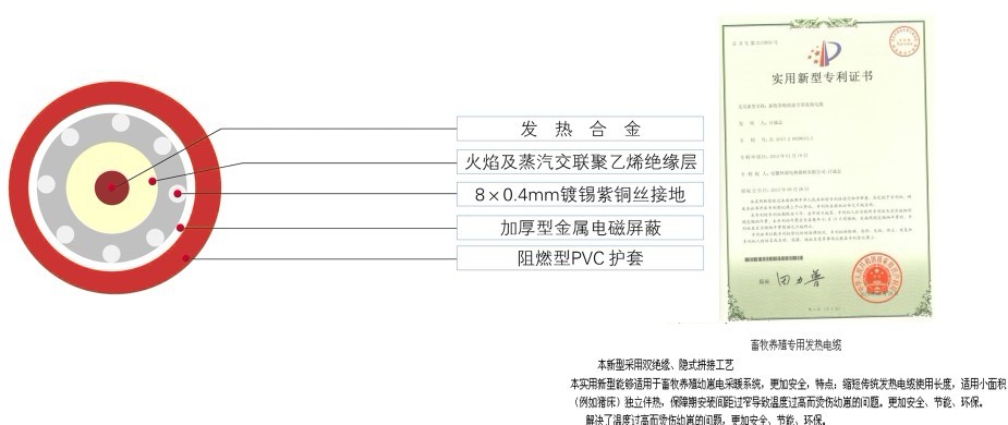 我司提供的一種畜牧養(yǎng)殖幼崽專(zhuān)用發(fā)熱電纜,包括有發(fā)熱合金,所述的發(fā)熱合金外依次包覆有塑料導(dǎo)體、氟隆絕緣層、火焰及蒸汽交聯(lián)聚乙烯絕緣層、鍍錫紫銅絲接地、加厚型金屬電磁屏蔽層、阻燃型PVC外護(hù)套和彈性橡膠軟套,所述的發(fā)熱合金和塑料導(dǎo)體融為一體,防止電打火的情況發(fā)生。