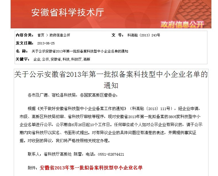 根據(jù)《關(guān)于做好安徽省科技型中小企業(yè)備案工作的通知》(科高秘〔2013〕111號),經(jīng)企業(yè)申請,市級、高新區(qū)科技局初審、省科技廳審核等程序,安徽環(huán)瑞入選2013年第一批備案科技型中小企業(yè)。