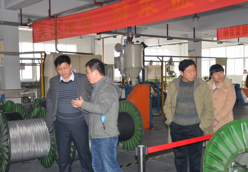 縣委孫書記、開發(fā)區(qū)領(lǐng)導(dǎo)仔細(xì)聆聽計(jì)總介紹關(guān)于我司自限溫電熱帶,恒功率電伴熱帶生產(chǎn)工藝流程