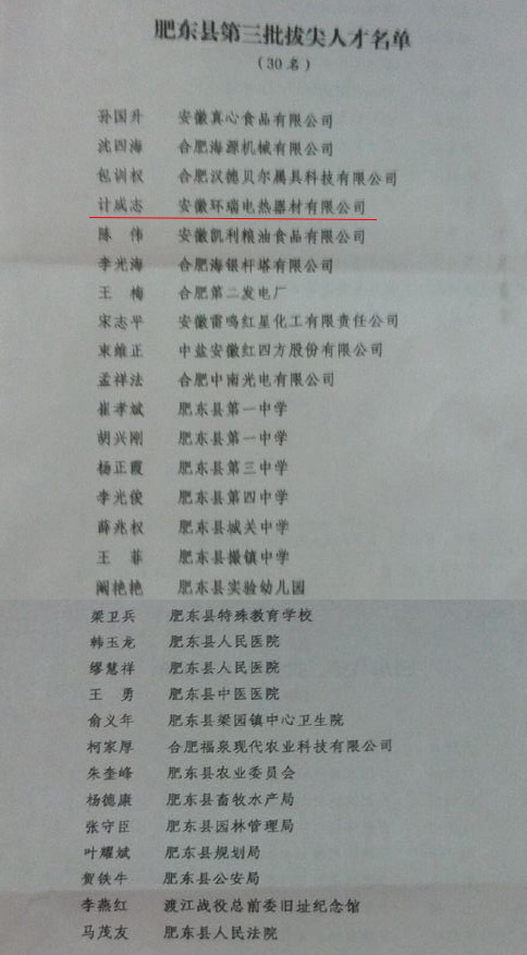 肥東縣委、縣政府為表彰環瑞公司對肥東縣當地經濟發展所作的貢獻,特授予環瑞董事長計成志“肥東縣第三批拔尖人才”榮譽稱號。