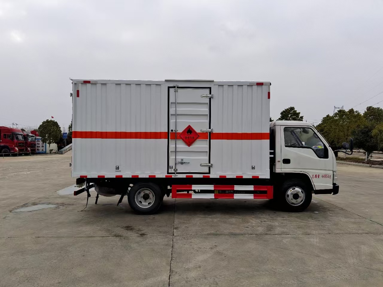 | 貨箱配置 | 廂體為雙層金屬骨架結構,外板采用冷軋鋼板,中間填充阻燃泡沫,內飾為鋁板。底板為平板上鋪防靜電膠皮。廂內兩側加裝固定貨物臥環,門框帶防盜報警器,頂部帶煙霧報警器,廂體右側選裝側門,隨車配2個滅火器,危險標志牌,防火帽,危險品三角頂燈。 | ||