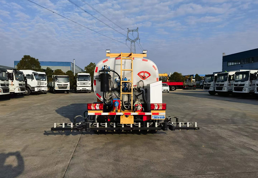 該車廣泛應用于修筑高等級公路瀝青路面灑布作業,主要專用裝置瀝青罐體,瀝青噴灑系統,罐體總容量:0.81立方米,有效容積:0.77立方米,罐體外形尺寸(長×寬×高)(mm):2350×1800×1350,介質:液態瀝青,密度:900千克/立方米;罐體保溫層厚度為355mm;側防護材料采用鋁合金,螺栓連接;后防護由專用裝置代替,下邊緣離地高360mm;ABS型號/廠家:CM4XL-4S/4M/廣州瑞立科密汽車電子股份有限公司;后部安裝工作燈,僅在夜間駐車狀態下起照明作用,行駛過程中不可點亮。外形長與前懸/軸距/后懸(mm)的對應關系為:5520/1100/2850/1570,5520/1075/2950/1495。隨底盤選裝駕駛室,選裝底盤附件儲氣筒尿素罐安裝位置。