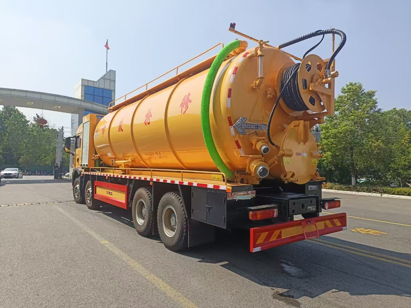 | 上裝配置 | 罐體總?cè)莘e約33立方,清水箱約10立方,其余為污水罐,加強大架,兩倉互通,采用8mm碳鋼制作,吸污部分,副發(fā)采用420馬力配258水循環(huán)泵,8米吸污管,罐體兩側(cè)加寬平臺加護欄,后部開一個600mm液壓開啟排污口,一個150排污球閥,和一個100的排污球閥,100內(nèi)抽球閥,后部左右各一個箭頭燈,配品浮350流量,配100米內(nèi)徑25定制耐磨高壓管,帶卷盤,卷盤液壓左右旋轉(zhuǎn)。 | ||